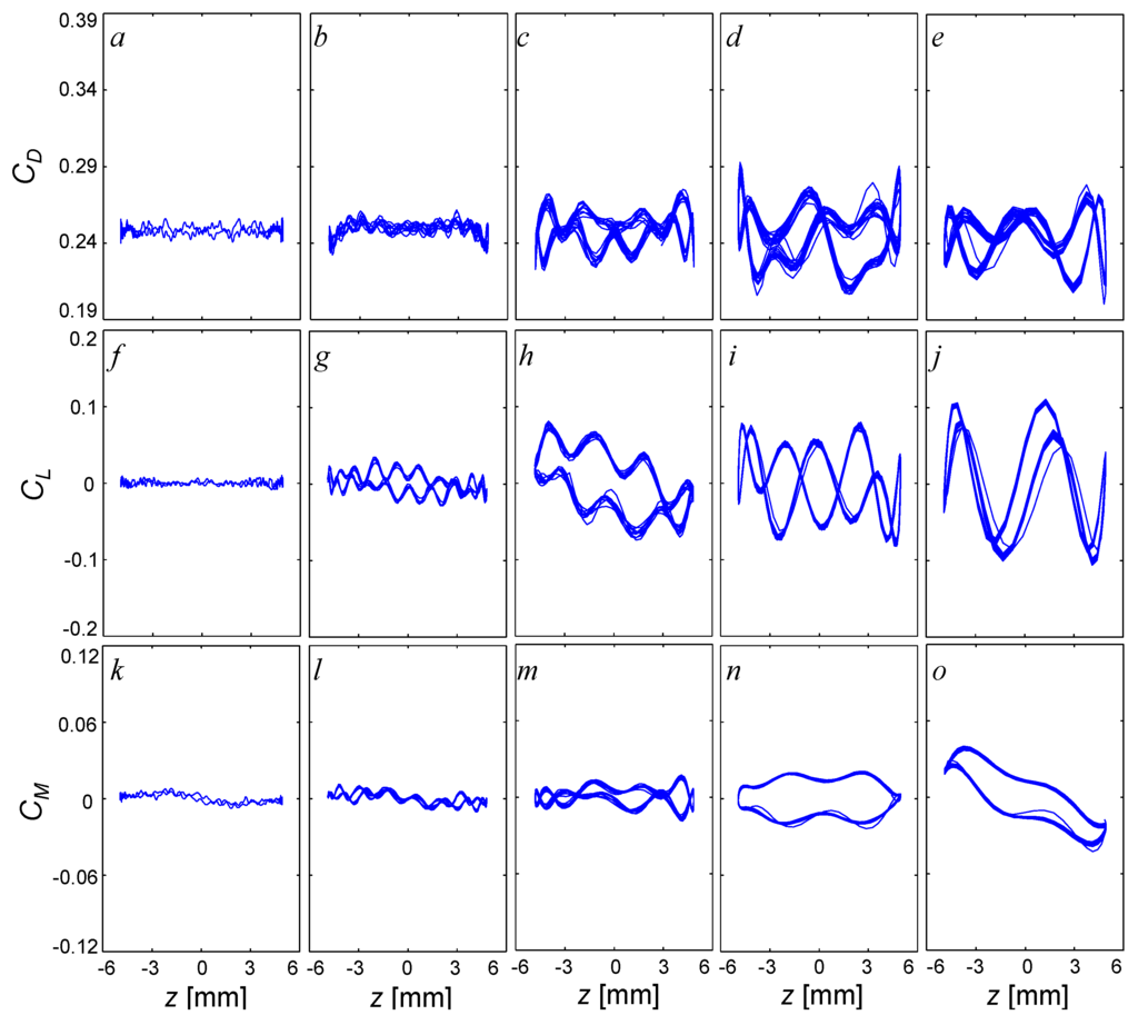 The second motion investigated is dynamic z = ±5 mm (z/D = ±0.056) amplitude simple harmonic plunging, shown in Figure 11. Figure 11a–e show CD, Figure 11f–j show CL, and Figure 11k–o show CM with the plunging coordinate, z, analogous to Figure 10, with the same flow conditions, frequencies, and timing. As the motion increases in frequency, the time averaged CD stays around the same at 0.24, with the introduction of a higher frequency fluctuation (varying in magnitude from 0.01 to 0.08 in Figure 11a–e) attributed to the wake instability. The quasi-steady CL is approximately invariant (Figure 11f), but has the introduction of a small negative slope at higher frequencies (CL/z = 0.015/° at 10 Hz, 0.01/° at 15 Hz, and 0.015/° at 20 Hz) in addition to a large higher frequency fluctuation (also attributed to shedding). This negative average slope of CL with z implies that the model is stable in plunge, as the aerodynamic force opposes the plunging direction. The quasi-steady CM has slight variations, shown in Figure 11k, with negligible slope throughout its frequency, until the plunging frequency is 20 Hz, with the introduction of a CM/z slope. This may be due to small deviations between the commanded zero pitching angle of the model and the realized pitching angle, as the pitching moment is very sensitive to pitching angle at this large unsteady frequency (compare Figure 10o and Figure 11o).