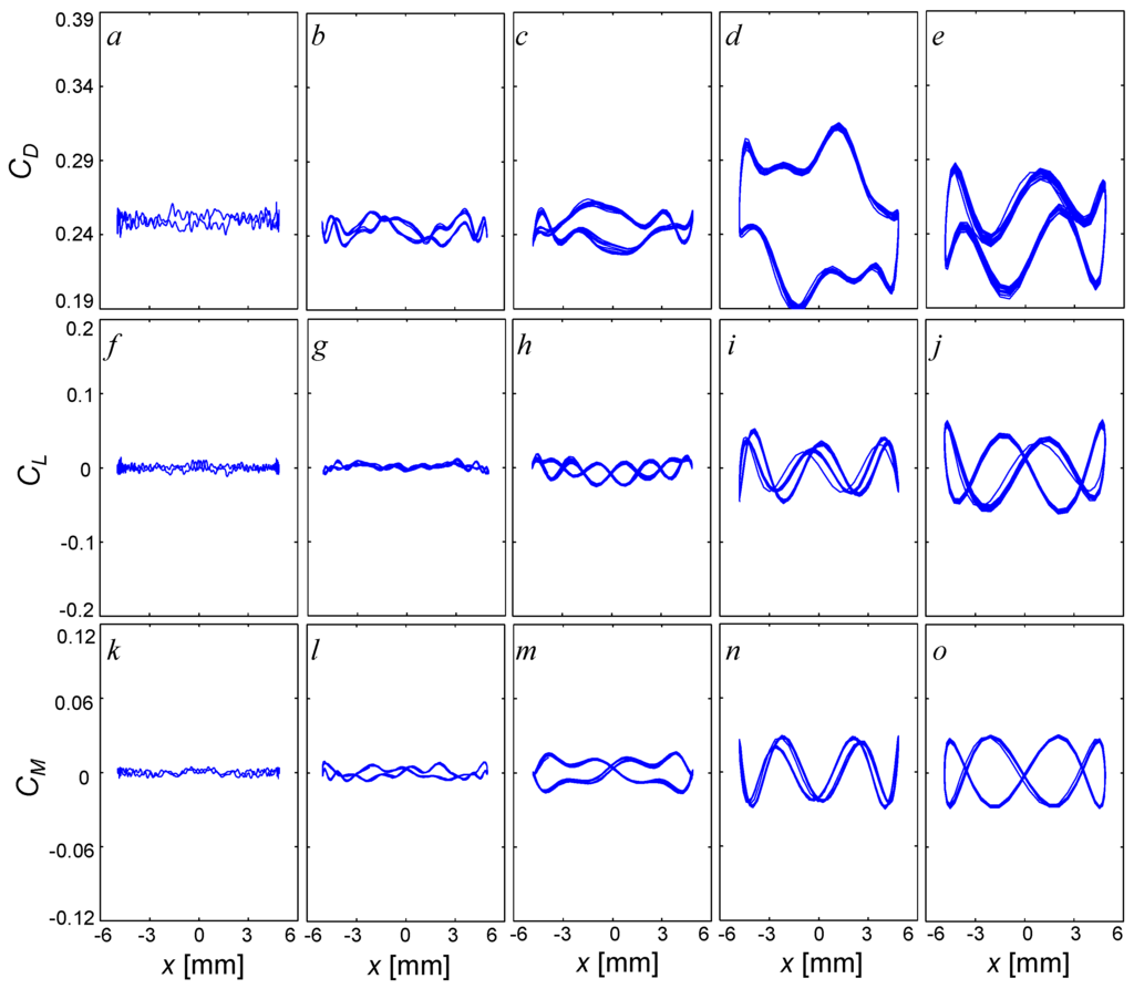 The third and last canonical motion is dynamic x = ±5 mm (x/L = ±0.030) amplitude simple harmonic streamwise displacement, shown in Figure 12. CD (Figure 12a–e), CL (Figure 12f–j), and CM (Figure 12k–o) are presented with the same frequencies, timing, and conditions as Figure 10 and Figure 11, for completion. For this motion, it is noted that both the motion and the freestream velocity are in the same direction, so the predominant changes occur in CD, while the changes to CL and CM are attributed only to phase locking to the instability in the wake, and are approximately symmetric with zero time averaged values (Figure 12f–o). The time averaged value of the drag retains a value of approximately 0.24, with a growth in hysteresis at 10 Hz (Figure 12c), which maximizes at 15 Hz (Figure 12d), and then decreases at 20 Hz (Figure 12e). It is noted that for most of these drag measurements the average slope of the drag is zero, with the exception of 15 Hz where there is a slight slope of CD/x of −0.01/° which suggests this motion is neutrally stable (the aerodynamic drag is roughly invariant to changes in streamwise coordinate throughout most frequencies). This can be expected as this motion can be analyzed as a fluctuation of the freestream with a value of 2πfx = ±0.0314 to 0.628 m/s, which should not induce large fluctuations in the steady drag coefficient, and the only induced effects are expected to be induced in the unsteady aerodynamics regime.