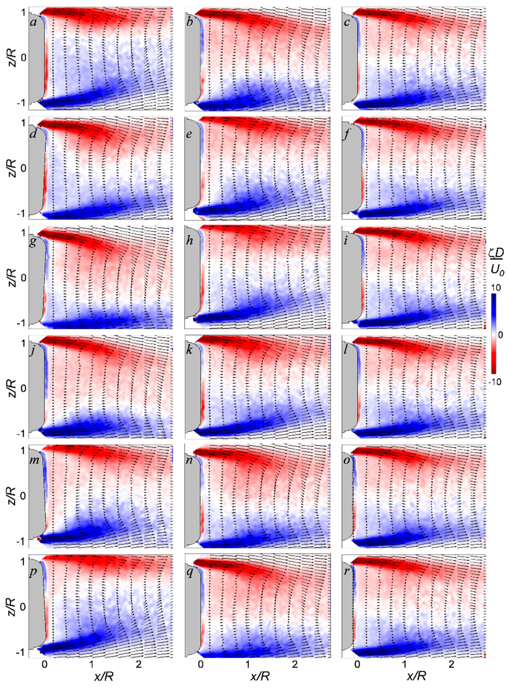 Raster plots of the phase-averaged vorticity field with overlaid phase-averaged velocity vectors for simple harmonic motions (f = 20 Hz) in αy = ±3° pitch (a,d,g,j,m,p), z = ±5 mm plunge (b,e,h,k,n,q), and x = ±5 mm streamwise displacement (c,f,i,l,o,r), at phases t/τ = 0 (a–c), 0.167 (d–f), 0.333 (g–i), 0.500 (j–l), 0.667 (m–o), and 0.833(p–r) with a flow ReD = 2.3 × 105.