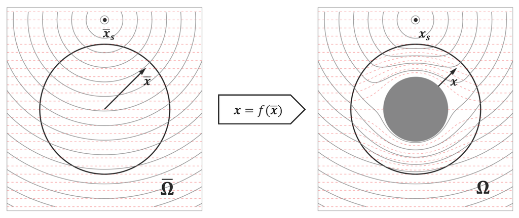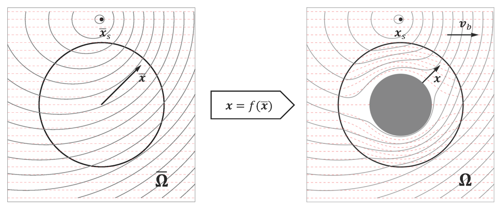 Effect of coordinate transformation on straight lines (red, dashed) and wave fronts (gray, continuous lines) from the virtual domain to the physical domain Ω. Object and source moving with velocity .