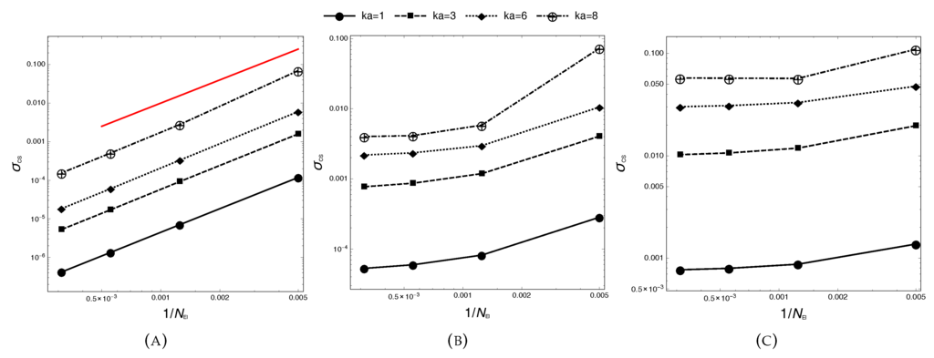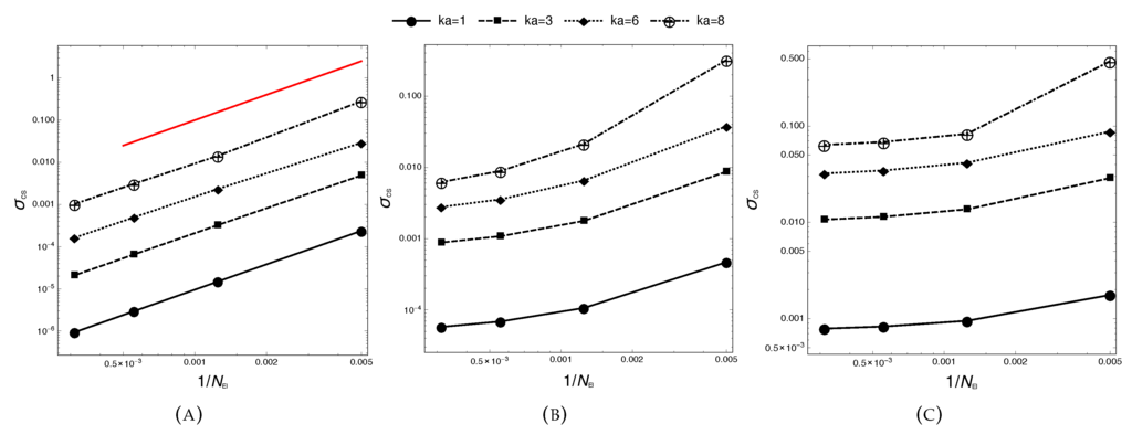 Convergence of with the number of field elements in , , for four values of . Equation (3). Mach number (A, B, and C, respectively). The red line indicates the rate.