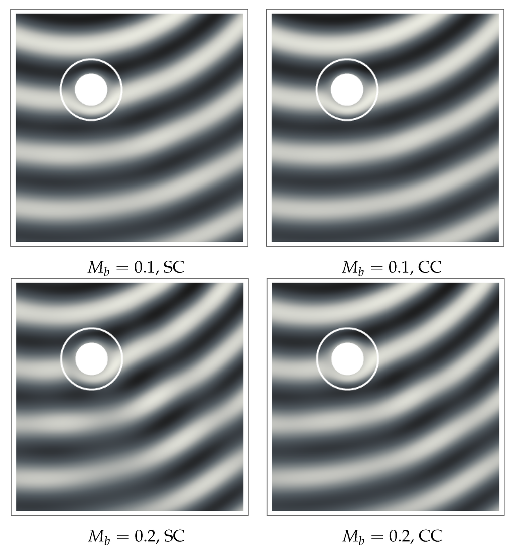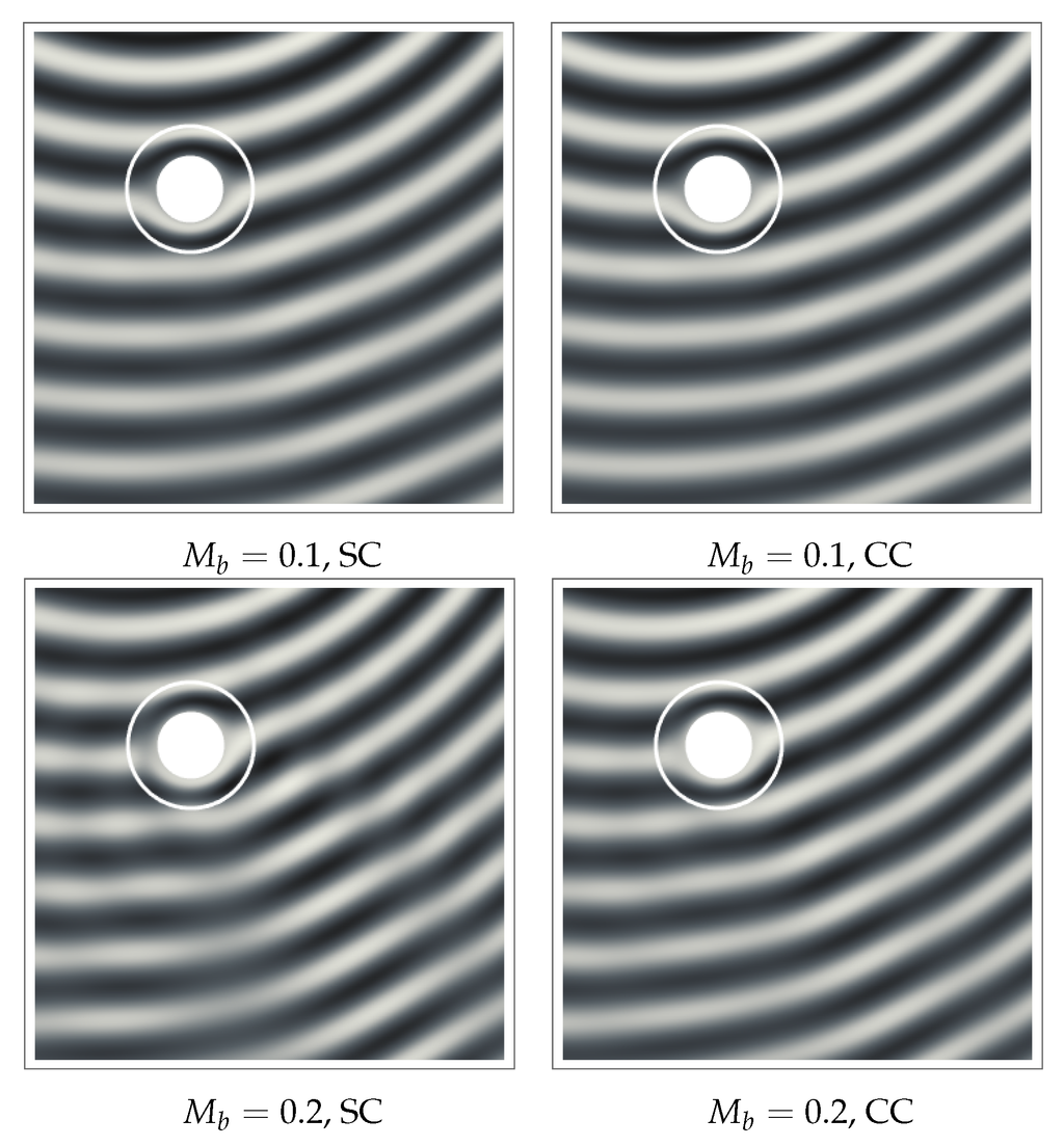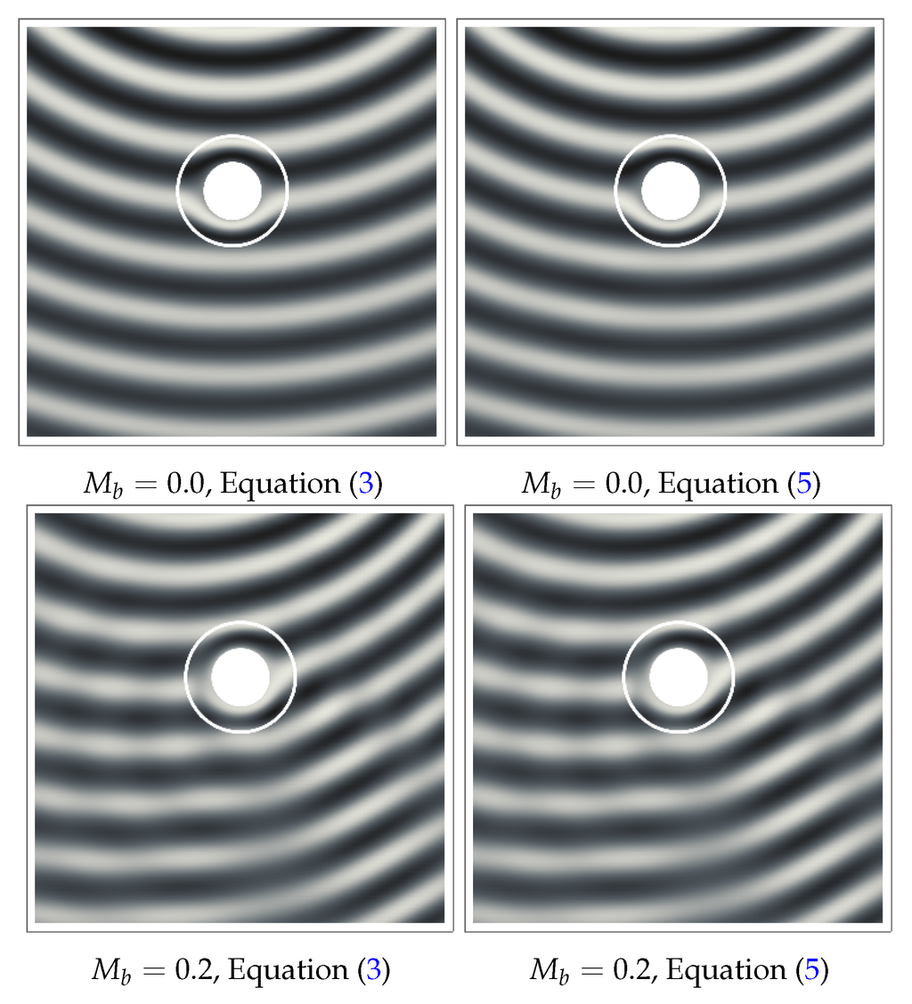 Equation (6) simply states that an observer moving at speed sees the acoustic perturbations in as propagating in a fluid moving as a uniform stream with velocity . It is important to notice that Equation (6) does not take into account the aerodynamic perturbation velocity induced in the surrounding medium by the motion of the obstacle, nor its modification due to the presence of the cloaking layer. This limitation necessarily yields an unphysical matching condition at the outer interface. This will result in an imperfect cloaking of the object even in the presence of the convective metamaterial design (see Section 5). On the other hand, Huang et al. [] shows that the use of a convective cloak design produces an improvement of the masking capability even if the simplistic assumption of a uniform stream is used (see Figure 1 of []) and that the introduction of a more realistic external flow pattern recovers the complete cloaking property of the metamaterial layer. As already mentioned, one of the objectives of the present paper is the development and the preliminary validation of an efficient numerical solution of the aeroacoustic cloaking based on the integral formulation of the problem, and for this reason, the analysis is limited to the uniform stream assumption.