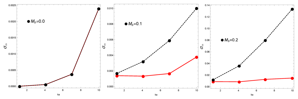 The efficiency loss observed in the presence of motion can be substantially reduced using the corrected cloak design presented in Section 4. The effect of the local Doppler correction on the scattering cross-section is presented in Figure 7. As anticipated in Section 4, the corrected cloak design is applied only to Equation (5) to avoid the numerical evaluation of the derivatives of the correction factor in the divergence of ζ.