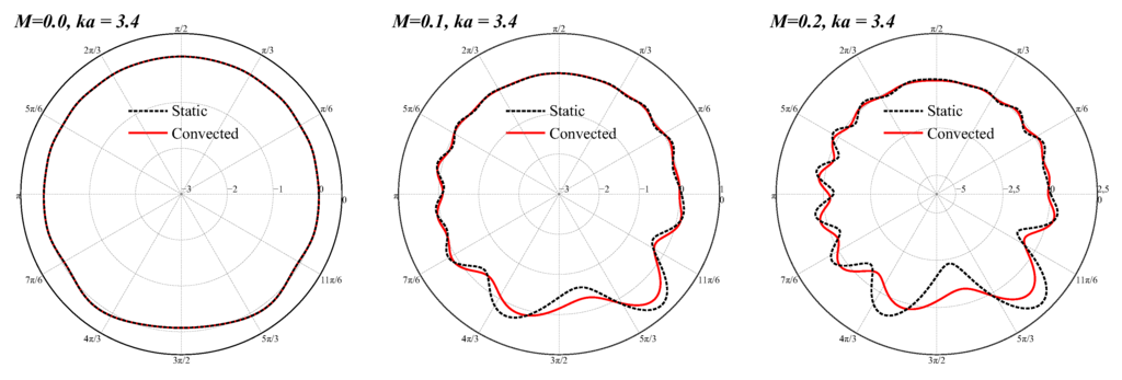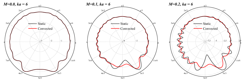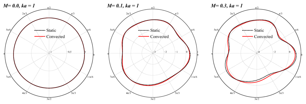 In case of planar wave fronts, and considering that the convective Mach observed in is , the correction indicated by Equation (19) reduces to Equation 11 of []. It is important to notice that the use of this correction in the present formulation is extremely simple. Indeed, Equation (20) simply changes into: