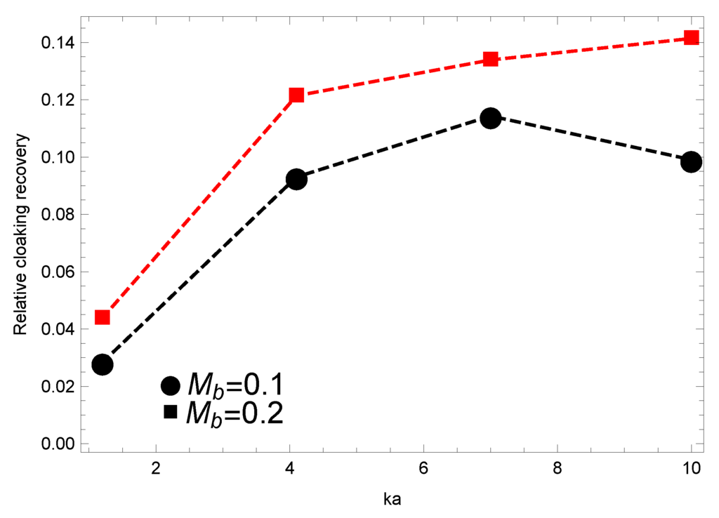 This result is confirmed by Figure 11, where the relative cloaking performance recovery is shown. The performance recovery is defined as , where superscripts and indicate the static and convective cloak design, respectively.