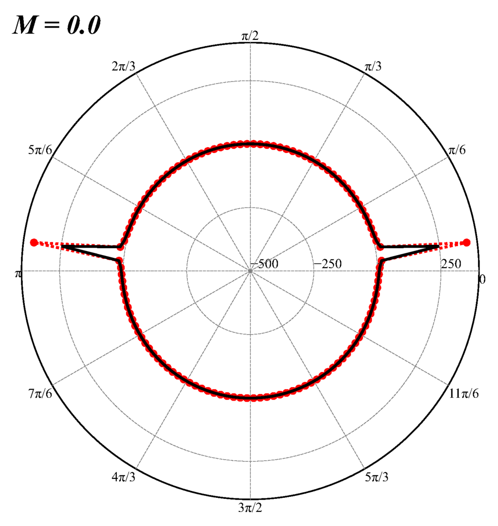 Figure 14 shows the results for the simple case of a monopole at rest. The polar distribution obtained at is compared to the theoretical value of required to guarantee the impedance matching with the free medium. The agreement with the theoretical prediction is remarkable. The azimuthal location of the impedance peaks (corresponding to an incoming local wave vector tangent to ) are perfectly captured, whereas their intensity is slightly underestimated, consistently with a substantially reduced, but not completely canceled, scattering field. Figure 15 shows the effect of the motion on the wall impedance polar distribution. The distortion of the azimuthal pattern induced by the motion of the obstacle and source is evident at and .