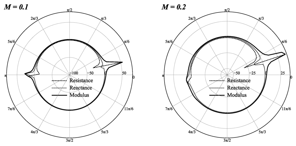 This section is dedicated to the re-interpretation of the results obtained in terms of an equivalent wall impedance distribution on . Indeed, the availability of a reliable end efficient tool for the modeling and simulation of metamaterials in aeroacoustics could be, in principle, considered as an alternative approach to the non-trivial task of identifying the optimal distribution of surface impedance required to attain a specific acoustic response. In aeronautics, this possibility would represent a major improvement in the design of specific passive noise-controlling devices, such as nacelle liners and high-lift device surface treatments. Indeed, the estimate of the wall impedance in the presence of flow is not a trivial task (see, e.g., [,,]). The numerical simulations required are extremely time consuming (and often not completely reliable), and experiments are extremely expensive. Consequently, the design of noise abatement devices is a design task that absorbs a large amount of resources, especially in the presence of environmental constraints becoming stricter and stricter. In this preliminary work, we address the problem simply by assuming that the outer boundary of the cloak is a locally-reactive surface and evaluating the local impedance . It is important to stress the fact that we are not claiming that the metamaterial could act as a locally-reacting surface. It is simply a re-thinking of the problem to guess what kind of locally-reacting surface treatment could mimic the behavior of our cloaking device. The rationale behind this stems from the consideration that the aeronautical industries have developed advanced technical capabilities in the realization of active and passive surface treatments to attain specific impedance distributions, and in most cases, the major difficulties are in the identification of the impedance distribution required for a specific acoustic response. To this aim, the acoustic metamaterial theory could be interpreted as a tool to circumvent these difficulties. This evaluation of is simplified, in the present formulation, by the use of the velocity potential function as the unknown function in , the acoustic flow on being directly obtainable from . In a locally-reacting surface, the normal component of the particles’ acoustic velocity is proportional to the local value of the acoustic pressure through the complex value of the acoustic admittance, . For such a surface, acoustic invisibility can be achieved through the perfect matching of the local value of with the specific impedance of the medium, . Indicating with α the angle between the local normal to the surface and wave vector of the impinging perturbation, the reflection coefficient is defined as (see, e.g., []):