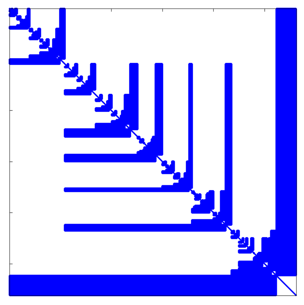 A remedy of this dilemma is the AMLS method, which generalizes CMS in the following way. Again, the graph of is partitioned into a small number of subgraphs, but more generally than in CMS, these subgraphs in turn are sub-structured on a number p of levels. This induces the following partitioning of the index set of degrees of freedom. is the set of indices corresponding to interface degrees of freedom on the coarsest level, and for , define to be the set of indices of interface degrees of freedom on the j-th level, which are not contained in . Finally, let be the set of interior degrees of freedom on the finest level.