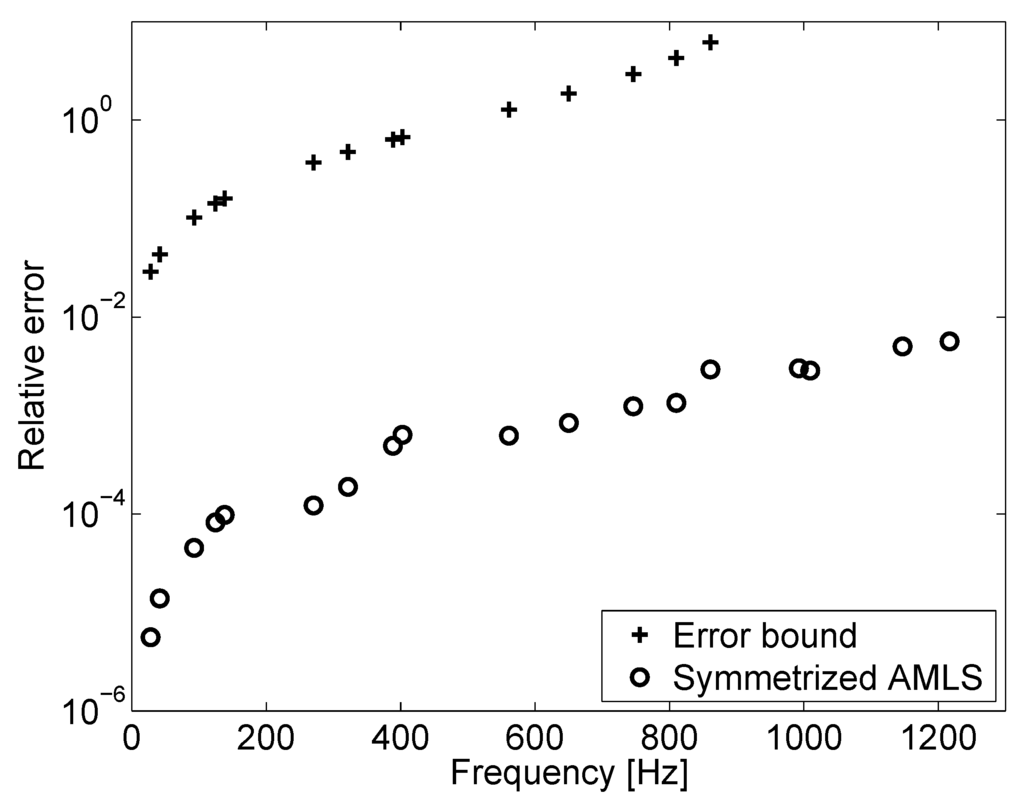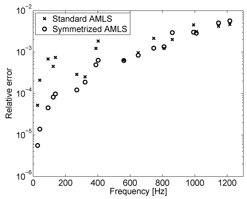 We applied the AMLS variant to the coupled fluid–solid problem and compared the eigenvalue approximations to those obtained from the standard procedure for the decoupled problem. In both cases, the algorithm was performed on 10 sub-structuring levels and 751 structures using a cut-off frequency corresponding to 10,000 Hz on each partitioning level. The relative errors are displayed in Figure 8.