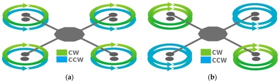 Overlapping rotor propulsion systems in the UAV field can be used in a variety of ways. The most conventional design implements three overlapping rotor units in one platform, which individually operate at the zero torque condition. Moment equilibrium is achieved when the rotors in the overlapping propulsion unit rotate in different directions (clockwise and anticlockwise). There is a possibility to discard unit torque equilibrium when an equal number of overlapping rotor units are used. One example of such a system would be the co-axial quadrotor (Figure 1a). Overlapping rotor units on such platforms can be designed to have rotors spinning at different rates, disregarding the torque produced, rotors could also spin in the same direction as long as there is another overlapping unit in the system counteracting the induced torque moment (Figure 1b). However, there has been sparse empirical data produced to quantify efficiency gains or losses if such designs were implemented.