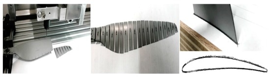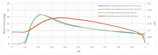3D scanning was conducted using a handheld scanner (ZScanner 600) (ZCorp, Rock Hill, SC, USA). The scanner has a resolution of 0.1 mm. Upper and lower surfaces of the rotor were obtained separately due to the constraints of the scanner itself. SolidWorks CAM (SolidSolutions, London, UK) software was used to manage and stitch both surfaces together. For extra accuracy 2D isometric images were used to provide surface alignment references, as well as scanned features, like rotor hub holes. The reconstructed model was sliced at various span locations to obtain airfoil contours (Figure 4).