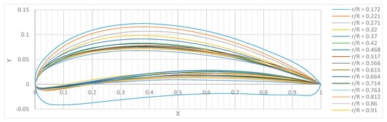 Two-dimensional airfoil shapes (Figure 7) were obtained using cut section tracing together with reconstructed sections of a 3D scanned rotor. Similar to the external geometry measurements, 3D scanning has required more work and provided a much coarser map of 2D airfoils, and was used only to sanity check data gathered by physically cutting a rotor into sections. Some of the recreated airfoils closer to the blade root could not be recognized or linked to any well-established airfoil family. For the purpose of this research defining rotor blade airfoils was not crucial, therefore, only bespoke airfoil coordinates were are shown (see Supplementary Material Table S1).