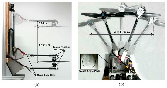 Overlapped rotor propulsion system test rig. (a) The test-rig side view shows maximum axial rotor separation; (b) The test-rig top view shows maximum rotor horizontal separation.