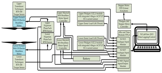 RTS-100 (Transducer Techniques, Temecula, CA, USA) reaction torque sensors were mounted underneath each motor/rotor assembly (Figure 8a). The sensor data-gathering and test rig control is achieved using National Instruments and Phidgets modules (listed in Figure 9). The test rig was programmed and controlled using Labview 2015 (National Instruments, Newbury, Berkshire, UK). The measurements were aquired at 2 kHz from all of the load cells simultaniously. A maximum of 7000 RPM was used in any test, which gives a minimum resolution of 4.2° when a 5 s data sample is taken. Initial tests revealed close to 2% scatter in the measured torque and thrust. Both rotors were initially individually tested on both arms to obtain a grasp on any asymmetry in the data, since the configuration of the test rig has arms on opposite sides of the rotors. Test results showed that performance difference between both tested arm locations is negligible. The same results have been found by McAlister et al. [16] and Ramasamy [15].