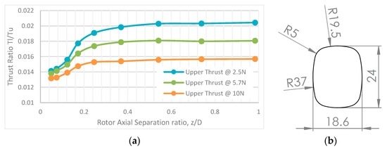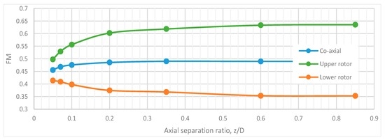 The individual rotor performance, when operating in the co-axial torque-balanced () setup at various axial separations, was tested (Figure 14). The performance of the co-axial system and the individual rotors was compared using the figure of merit (FM), which was derived by Leishman and Syal [31]. FM for individual upper and lower rotors is given by: