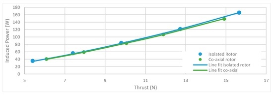 The co-axial system was compared to two identical isolated rotors to further understand the interference effect and percentage efficiency losses involved (Figure 15). Momentum theory (Case 4b) predicts that interference factor for torque balanced co-axial system, when lower rotor is operating in a fully-developed slipstream of the upper rotor, is (a detailed derivation of all momentum theory cases can be found in [31]). The efficiency loss proportional to the interference factor for the co-axial system was calculated using Equation (6):