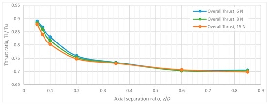 Effect of axial separation z/D at partial rotor overlap d/D = 0.85 (overall thrust, 8 N).