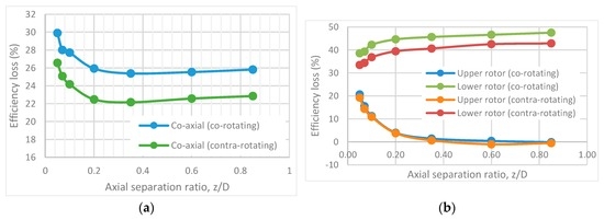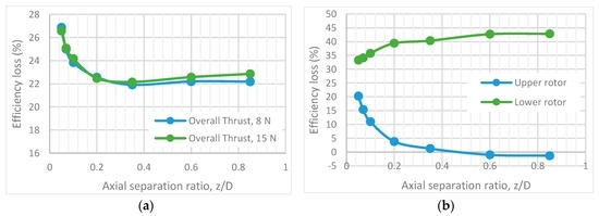 Co-axial propulsion system efficiency losses at various z/D ratios. (a) Overall co-axial system efficiency losses (); (b) Individual rotor efficiency losses when operated in a co-axial setup ; overall thrust, 8 N.