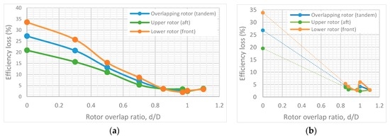 Overlapping rotor (tandem) performance in terms of percentage efficiency loss over two isolated rotors (z/D = 0.05): (a) overall thrust = 8 N; and (b) overall thrust = 15 N.