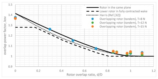 Figure 20 shows measured data compared to the momentum theory-derived overlap interference factor . Rotor interference data was obtained from the test results when the rotors were operating at an axial separation distance of z/D = 0.05, which equates to approximately 20.3 mm rotor plane separation since the tested rotor diameter is 406.4 mm. The whole range of tested rotor overlaps at an overall thrust of 8 N seems to agree fairly well with the momentum theory-derived interference factors for the rotors operating in the same plane. Additionally, in the region of 0.35 < d/D < 0.85, it follows the curvature of derived overlap interference by Harris [32].