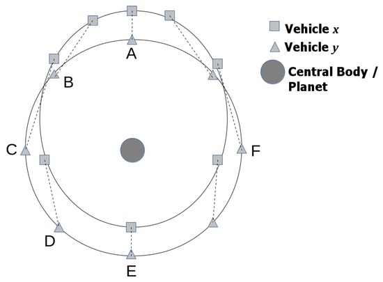 Consider Figure 1, illustrating the trajectories in inertial space over one orbit (). The solid lines represent the orbital trajectories of two vehicles, with dashed lines showing the relative position of two vehicles, labeled x and y, during one complete orbit.