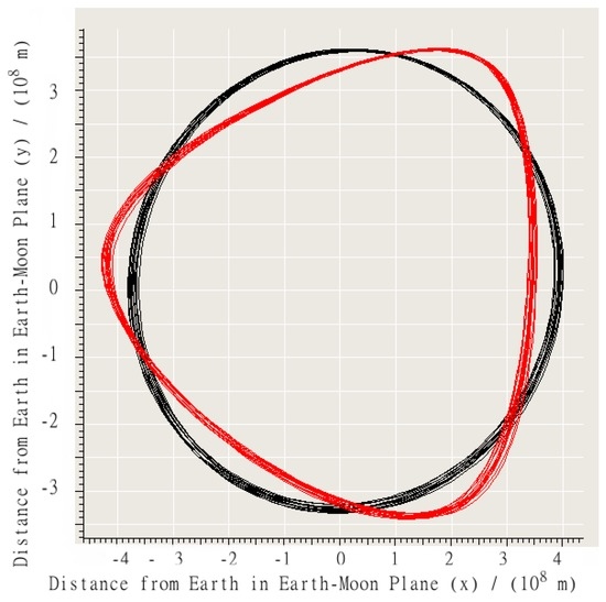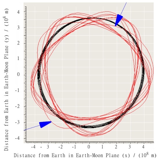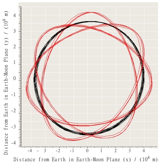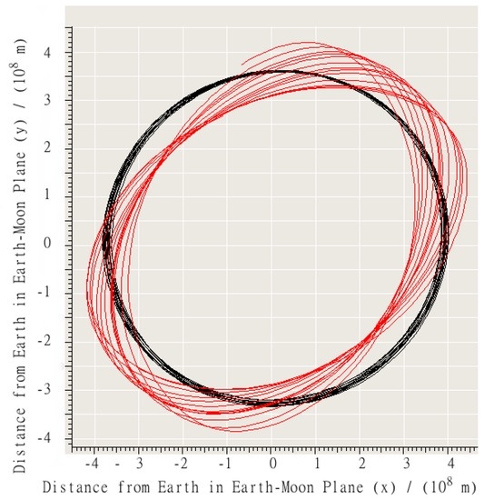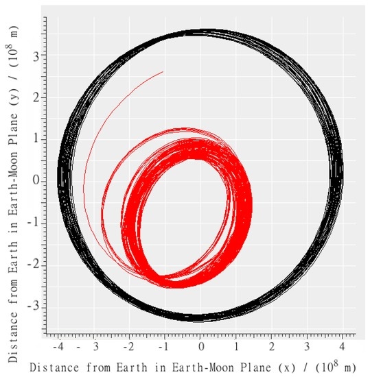 A characteristic trajectory over 1 month from the left-edge of the main stable zone in earth-centered coordinates. The black line (smooth circular shape) represents the trajectory of Moon. The red line (irregular pattern) represents the trajectory of a vehicle that was ultimately stable for 30 years.
