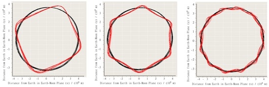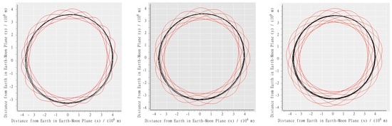 The 1:3:4 (left), 1:5:6 (center), and 1:11:12 (right) Resonances. In each plot, the black line (circular trajectory) represents the lunar orbit, and the red line (non-circular trajectory) the DRO. Both trajectories are shown relative to the inertial frame; the lines illustrate the respective trajectory on the Earth–Moon plane in the Earth-centered inertial frame.