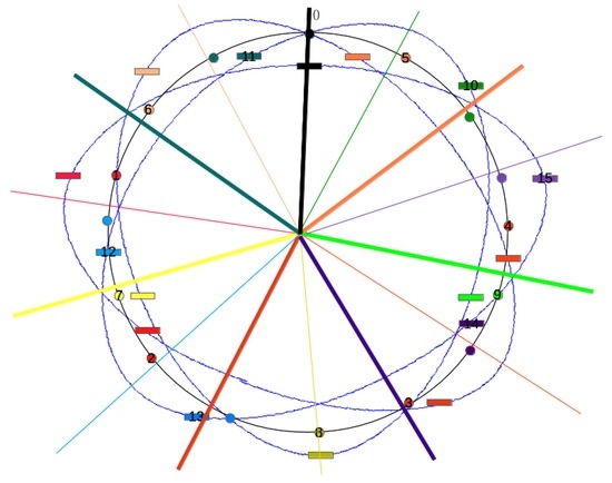 A timestamp breakdown of the 3:4:7 resonance in the Earth-centered inertial frame. Each timestamp includes a moon (small solid circle) and vehicle (rectangle). The moon and vehicle are color-matched, and each timestamp sequentially numbered. The grey circular line (on which the small circles are found) represents the trajectory of the moon, and the blue irregular line represents the trajectory of the vehicle. Starting at the top (black,0), both the moon and vehicle trace three earth-orbits before returning to the black state. The color-coordinated numerical sequence illustrates each quarter of the four lunar-orbits. The radial lines approximate the positions at which the vehicle is at inferior (thick lines) and superior (thin lines) locations relative to the moon; together, they illustrate the seven cycles in the rotating frame. The radial lines are color-coded to be close to the colors at a nearby time-stamp.