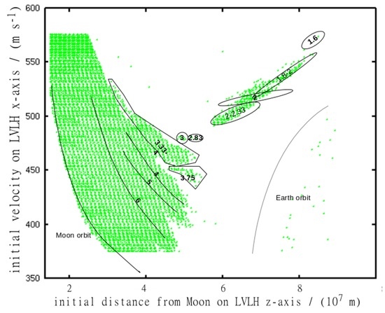 Note—in the more conventional discussion of resonance in which the resonances are expressed as the ratio between the orbital periods of two bodies through inertial space about a common barycenter, the resonance would be expressed as l:m using this terminology (see, for example, Murray [14]). However, because the vehicle must stay in the proximity of Moon, for any given month and this particular representation is not useful. Indeed, where resonant states are found, the bodies must return to their original relative positions after one complete cycle (recognizing that one complete cycle could take several months). Therefore, over one complete cycle and one of these values is completely redundant. We are more interested in the ratios between the periods of the vehicle around Moon (n or p), and Moon around Earth–Moon barycenter (m).