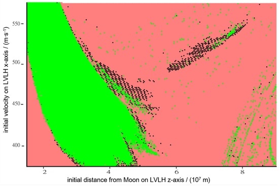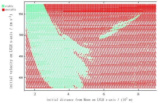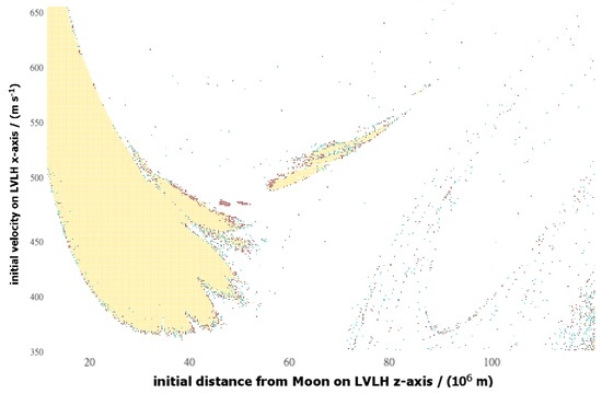 Figure 20. Graphical representation of the effect of radiation pressure on the stability of DROs. The horizontal axis represents the initial position (m), measured along the LVLH z-axis; the vertical axis represents the initial velocity (m·s), directed along the LVLH x-axis. The color axis is interpreted as: Yellow/light shading—initial conditions that produce 30-year-stable trajectories without radiation pressure and 5-year-stable trajectories with radiation pressure; Blue/medium shading—initial conditions that produce 5-year-stable trajectories with radiation pressure but did not produce 30-year-stable trajectories in the non-radiation pressure data set; Red/dark shading—initial conditions that produce 30-year-stable trajectories without radiation pressure but fail to do so with radiation pressure.