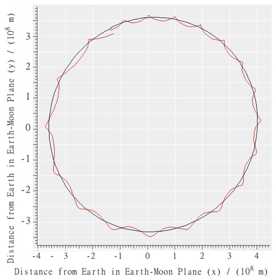 Notice that the vehicle orbit is quite definitely non-Keplerian. It is approximately elliptical, but with Earth at the center, not the focus, of the ellipse. This theoretical, geometrical solution is confirmed with simulation data. In Figure 3, the black line represents the lunar trajectory, and the red line the vehicular trajectory over a period of approximately 1 year. In this particular solution, the vehicular trajectory undergoes slow precession, the resonance is not perfect.