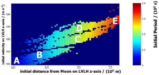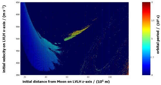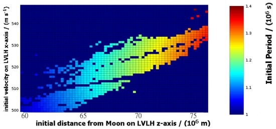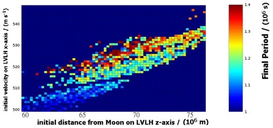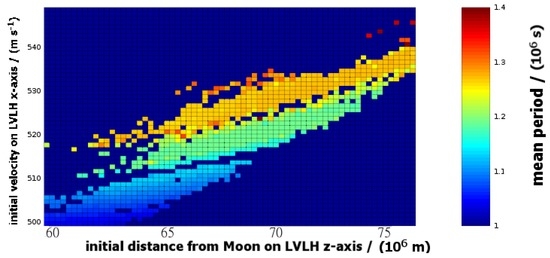 The final period between crossings of the LVLH y–z plane for those initial conditions that produced 30-year-stable trajectories. The time interval is shown in seconds on the color-axis as a function of the initial state. The horizontal axis represents the initial poisiton (meters), measured along the LVLH z-axis; the vertical axis represents the initial velocity (m/s), directed parallel to the LVLH x-axis. For reference, 1 sidereal month is approximately s. This plot can also be used to identify the 30-year-stable initial conditions. As such, it is similar to Figure 11, but provides more detailed coverage of the initial states.