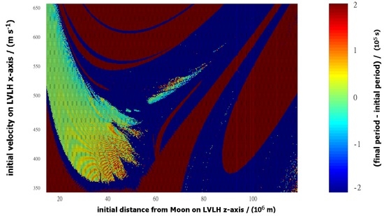 If the initial states identified in Figure 14 were asymptotically stable, then it would be expected that the initial periods and final periods (30 years later) would match. Conversely, a difference between initial and final periods for a vehicle that remains bound to Moon suggests an evolutionary process in the vehicle trajectory. In many cases, the comparison between the periods is close, but there are exceptions. The differences between the initial and final periods are shown in Figure 15.