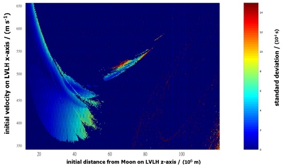 The standard deviation of the orbital period (color-axis) as a function of the initial state. As with Figure 15, the horizontal axis represents initial position (m) on the z-axis of the LVLH frame and the vertical axis represents the initial velocity (m·s) along the x-axis of the LVLH frame.