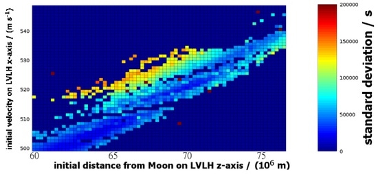 Figure 13 illustrates a peculiar case in which the initial conditions produce a trajectory that appears to be quite unstable, but unexpectedly remains stable for the full 30-year simulation time. The presence of such conditions suggests that there may exist some mechanism to “attract” states from such a quasi-stable initial state-space into a more stable state-space. To further investigate this phenomenon, the evolution of stable trajectories is evaluated. The extent to which the state drifts away from the initial conditions is evaluated by testing for variations in the orbital periods of stable trajectories. For this study, the orbital period is defined as the time interval between subsequent crossings of the LVLH y–z plane, with position at positive-z (between Earth and Moon).