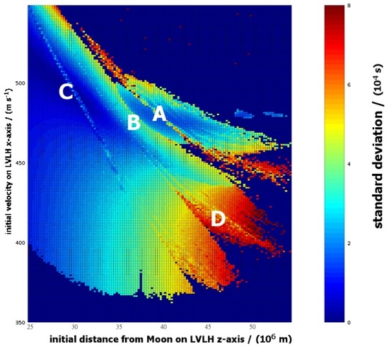 To further understand the stability of these orbits we need another single-valued characterization of the consistency of the periods throughout the entire thirty-year simulation. Conventional characterizations—such as trajectory plots and Poincaré sections are not applicable to large dispersed data sets because they inherently utilize two dimensions for presentation, and we only have one available. The alternative that can be useful is to consider the standard deviation of the period of each vehicle throughout its 30-year data-set. This is shown in Figure 16. Any initial states that lie close to asymptotically stable states would show consistent periods and consequently low standard deviation. Points of interest from Figure 16 are listed below and identified more clearly in the higher resolution images presented in Figure 17 and Figure 18. The causes of these features are not understood and warrant further investigation.