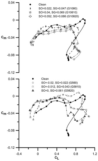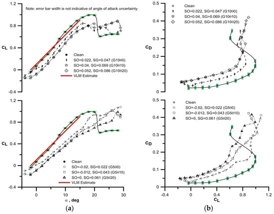The wing’s aspect ratio was 3 based on a chord of 0.125 m and a span of 0.375 m. Side plates extending from the floor to the roof of the test section (0.61 m high by 0.457 m wide) were also used to simulate nominally sectional flow. The distance from the wing trailing edge to the back of the side plate was 0.33 m; the plates extended ahead of the wing by 2 mm. When installed, the gap between the side plates and the wing was 0.6 to 0.9 mm as measured with a Feeler gauge for the full angle of attack range. Wind-tunnel testing was conducted at a freestream velocity of 35 m/s, yielding a Re of 2.5 × 105 based on the reference chord length of 0.125 m. Wind-tunnel data repeatability was established and verified through examination of the data from multiple runs; estimated 99.7% uncertainty intervals are ΔCL = 0.01, ΔCD = 0.008 and ΔCM = 0.01. These uncertainties are presented as error bars in Figure 2a,b for the Clean wing. Note that the width of the error bars in Figure 2a is not reflective of angle of attack uncertainty, but is for visibility. The pitching moment reference location was the one-quarter chord. Surface flow visualization was undertaken using Titanium Dioxide suspended in a mixture of Linseed oil, Kerosene and Oleic acid. For these tests, the model was set at the desired angle of attack. Subsequently, a thin layer of the paint mixture was applied. The tunnel was then rapidly brought up to the desired velocity. When the pattern was frozen, images were recorded. To aid in interpretation, a video was also recorded during the development of the patterns.