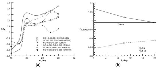 Effect of slat gap and angle on (a) the lift increment relative to the clean wing and (b) the maximum lift coefficient.