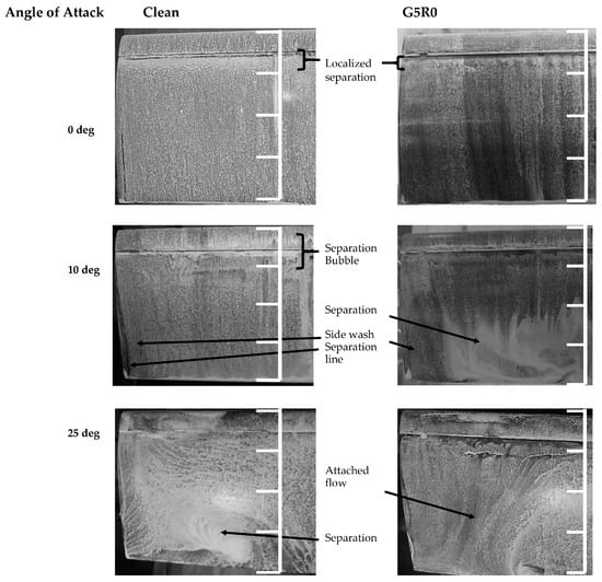 Effect of angle of attack and slat deployment (G5R0 geometry) on surface skin friction patterns. Flow is from top to bottom. Ruler divisions are one-quarter chord.