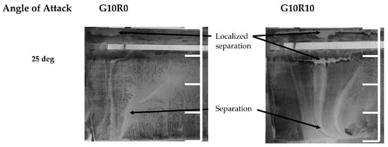 Figure 5 examines the surface flow topology between the G10R0 and G10R10 geometries at a 25° angle of attack. The G10R0 pattern reveals large-scale separation, which is of reduced extent with slat rotation (to 10°). Both configurations show separation on the slat. Slat rotation reduces the extent of separation and the nature of the separated zone. The G10R10 geometry shows the presence of a localized separation just after the “knee” at the front of the wing panel as well as spanwise flow towards the root near the trailing edge.