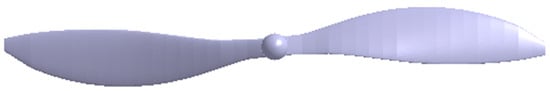 The APC Slow Flyer is a two-bladed propeller, with a fixed pitch and a diameter of 0.254 m. The propeller consists of thin airfoil profiles with a specific combination of a low Reynolds number Eppler E63 and a Clark-Y airfoil near the tip [15], inserted to form a sharp leading edge blade design, as shown in Figure 1.