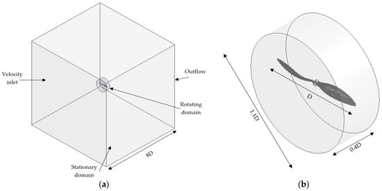 The numerical predictions presented in this study were performed using the ANSYS FLUENT 15.0 commercial CFD solver. The Multiple Reference Frame model (MRF) approach was used to numerically predict the flow around the propeller. The domain is defined and illustrated in Figure 2a. The domain is split into a global stationary domain and a subdivided rotating region, called the rotating domain. The rotating domain is specified by a smaller cylinder entirely enclosing the blades and the hub as shown in Figure 2b.