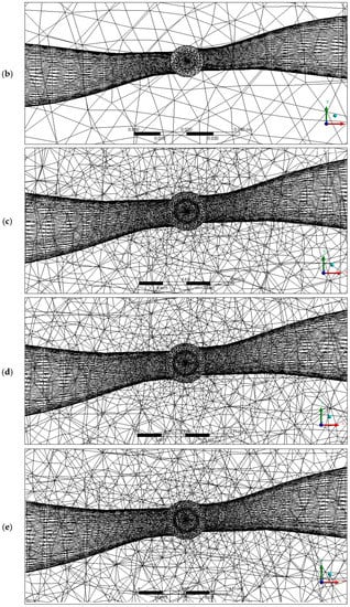Surface mesh of the propeller blade. The cells sizes near the blade wall are smaller and increase towards the outer boundary. (a) Standard mesh; (b) Coarse mesh; (c) Mid mesh; (d) Mid-Fine mesh; (e) Fine mesh.