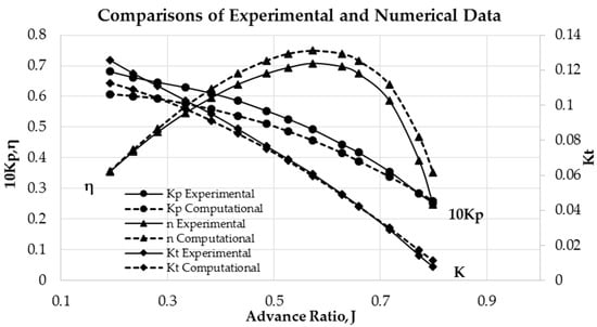 The numerical analysis results were compared with available experimental data to verify the influence of the grid and the quality of the obtained data. For all the computational analyses, the force and momentum were resolved in a three-coordinate system, whose parameters are x, y, and z. The axial force and momentum around the propeller axis define the thrust and torque, respectively. Thrust coefficient, , torque coefficient, , and power coefficient, , advance ratio, J and efficiency, η are defined in Equations (1)–(7).