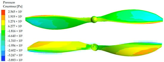 Figure 5 shows the pressure contour of the propeller blade operating at an advance ratio of J = 0.628. Based on the figure, it can be seen clearly that the pressure at the back-side of the propeller is slightly higher than the pressure at the front-side of the propeller. As in the aircraft wing, the pressure difference between the top and bottom surface of the wing creates lift force, allowing the aircraft to fly. In the case of the propeller, the pressure difference between the front- and back-side of the propeller is creating force in the forward direction, known as thrust.