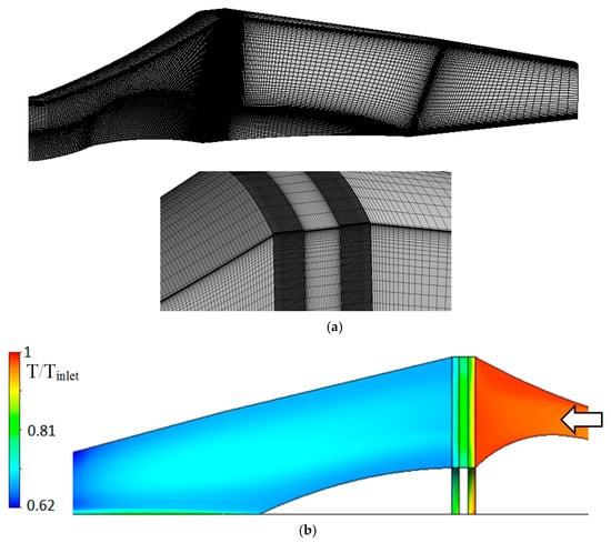 CORN (a) computational grid (45° sector); (b) static temperature non-dimensional distribution; (c) velocity streamlines.