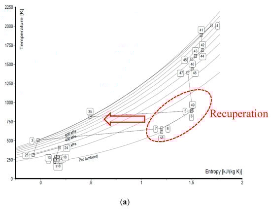 At the final stage of the study, the basic characteristics of the three heat exchanger concepts (i.e., NEWAC, CORN and STARTREC) were incorporated into GasTurb 11 software [26]. More specifically, the CFD-computed results were incorporated in the calculation of the IRA thermodynamic cycle which is presented in Figure 9, through appropriate coefficients for the inner flow pressure losses (cold-air), the outer flow pressure losses (hot-gas) and the heat exchanger effectiveness. The incorporation of these coefficients in the IRA cycle thermodynamic analysis quantifies the recuperator effect on waste heat exploitation from the hot-gas nozzle for preheating the compressor discharge air before combustion, leading to reduced fuel mass requirement, and the impact of the recuperator imposed pressure losses in both flow currents (inner-cold air, outer-hot gas). As a result, the thermodynamic cycle is properly adapted, from which the necessary data for the calculation of the specific fuel consumption can be extracted from Equation (9) where is the mass flow of the consumed fuel. Additional details can be found in [20].