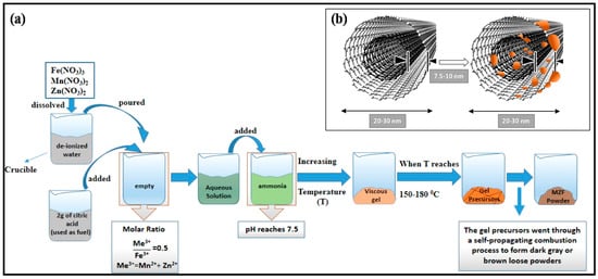 Manganese and zinc ferrite particles in the present study were prepared by a citric acid assisted sol–gel method shown in Figure 1. The sol–gel method has a wide range of applications because of its high efficiency, large productivity, and low production temperatures and costs. Conventional industrial methods for the manufacturing of ceramic and glass need very high temperatures [23]. Therefore, in general, the sol–gel process is known as soft chemistry. In addition, the sol–gel method is a multipurpose process where the morphology, structure, and the composition of the final materials can be tuned by altering the hydrolysis and condensation reaction proportions [26]. Here, we have listed the steps of the sol–gel process, such as the homogeneous precursor solution with solid materials, jellification, aging step, desiccation step, and densification step [27]. The procedure of material preparation as reported by Demir et al. [28] was followed exactly (for more details on material preparation, please consult [28]). A schematic representation of the synthesis of Mn–Zn ferrite powder particles is given in Figure 1a.