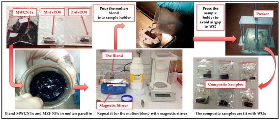 Manganese and zinc spinel ferrites (MZF NPs) have been used as filler magnetic materials after their synthesis by a citric acid assisted sol–gel method, which will be discussed in detail in the next section. A schematic illustration of MZF NPs blended with MWCNTs in a paraffin host matrix is presented in Figure 1.