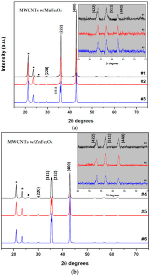 XRD patterns of samples fabricated with MZF NPs by blending commercial multi-walled carbon nanotubes (MWCNTs) according to the mass fractions: (a) MWCNTs with MnFe2O4 samples; and (b) MWCNTs with ZnFe2O4 samples.